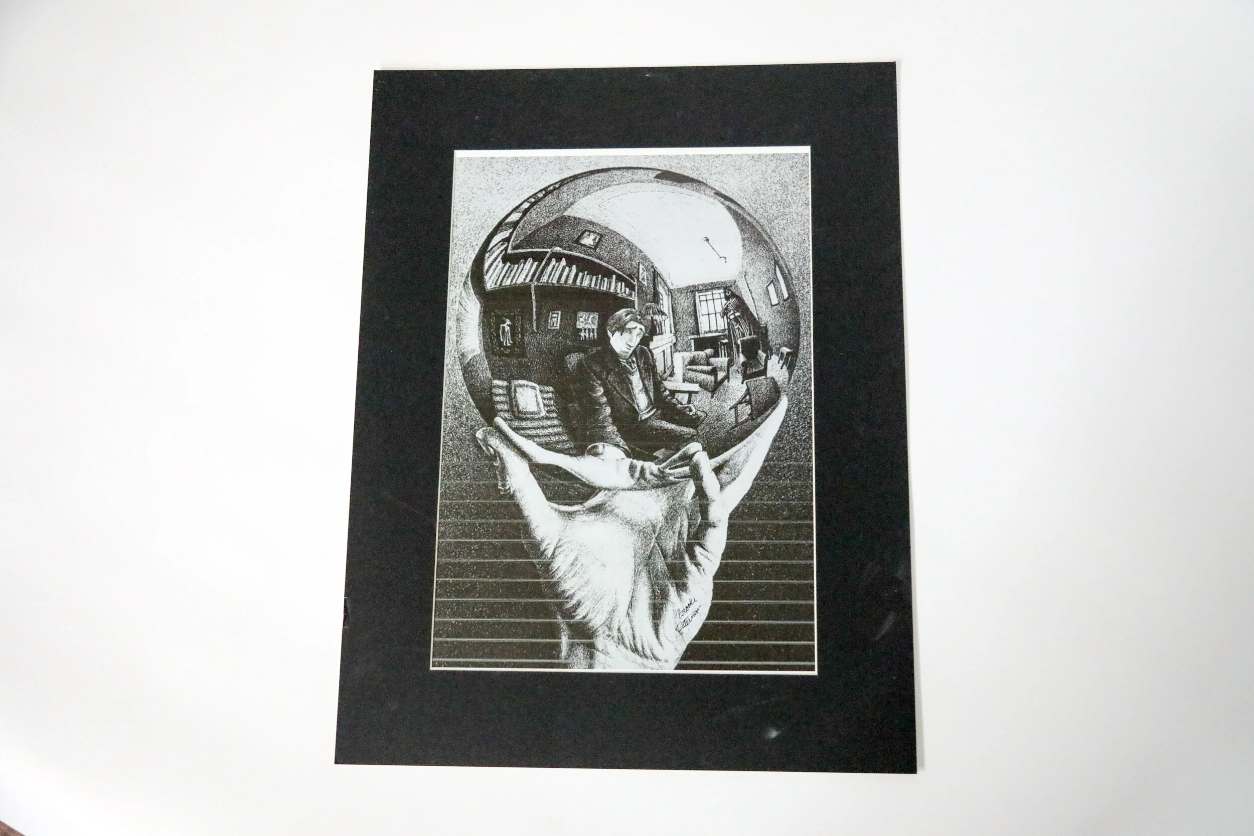This Photoshop work is a recreation of the famous lithograph print, “Hand with Reflecting Sphere,” by the Dutch artist M.C. Escher. How this project came to be was from the instruction from my high school art teacher who told us to find a famous artwork and manipulate it making it our own. I knew I wanted something different, something comical. In the past I drew similar sketches to those of Escher’s work, “Convex and Concave.” I remembered his style and being intrigued by his use of different perspectives, and looked up some of his well-known artworks. Once I caught sight of “Hand with Reflecting Sphere,” I knew right away what I wanted to change. From the Walt Disney animated movie “Tangled,” the rugged charismatic hero, Flynn Rider, was the first character I thought of to humorously replace the older man in the image. Rider’s most popular ladies look, The Smolder, perfectly gives off the impression of a man checking himself out in the mirrored orb. Once Rider was a part of the picture, I felt the work needed to include something else to be totally unique. I thought about Disney once more, thinking of another character to insert. Who else better to accommodate Flynn Rider than Darth Vader? Someone needs to keep that thief in check… Can you see him?